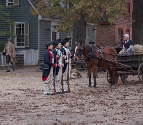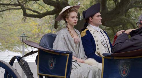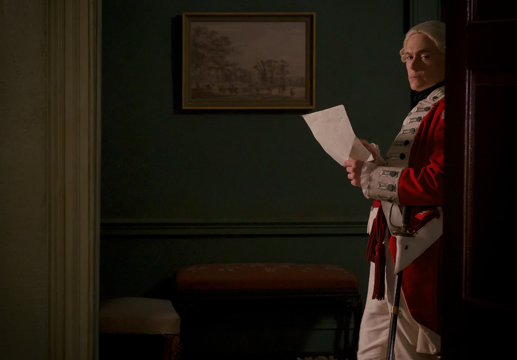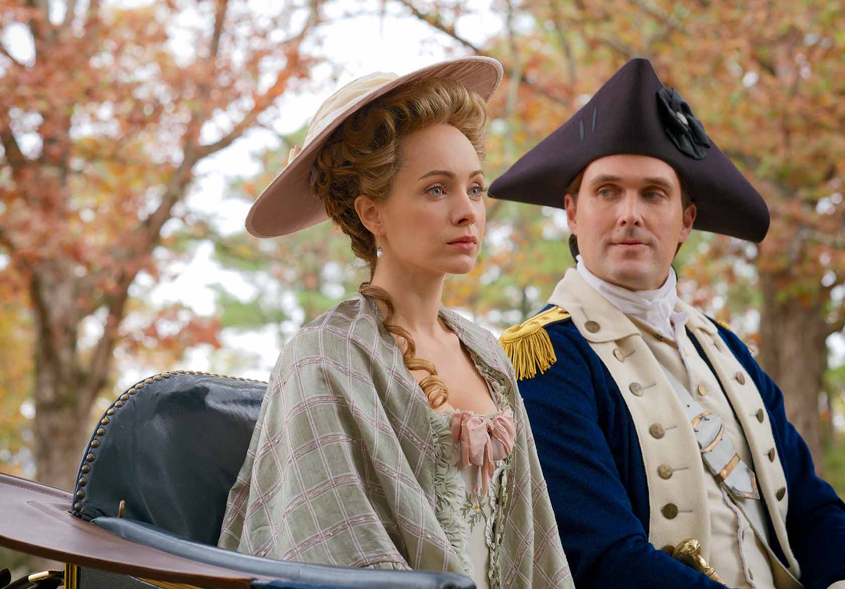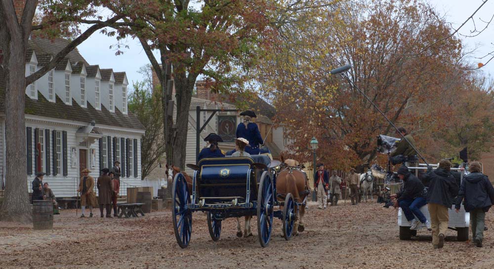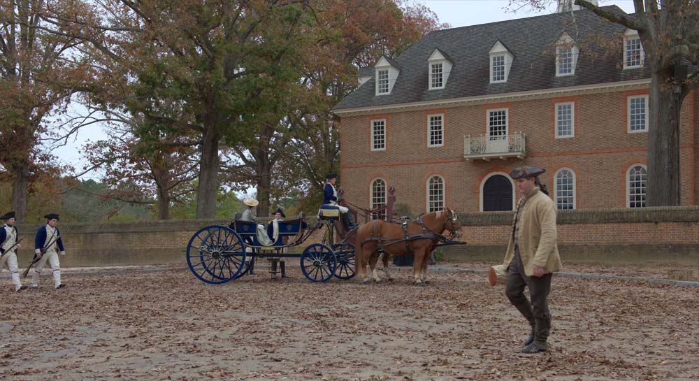 Above: "The exterior of Benedict Arnold’s house is actually the capitol building of Williamsburg, Virginia. All of the exterior shots of Arnold and Peggy at Penn Mansion [in the first episode of the season] were shot in Williamsburg, using elements from the town, including that carriage that they ride in." — Production Designer Caroline Hanania
