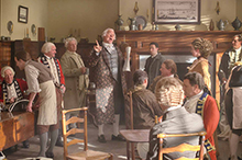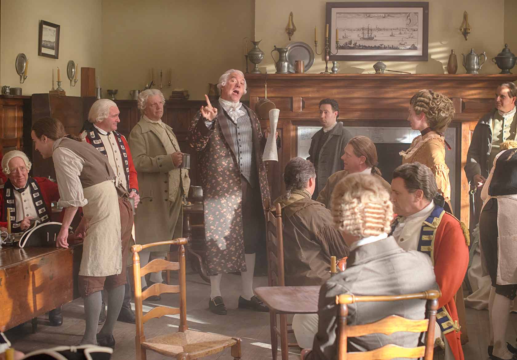 Right: "With Rivington holding court at his tavern in his “banyan” robe, I love the notion that all of these customers are his guests and he presides like a proud peacock over this establishment." — Costume Designer Lahly Poore-Ericson