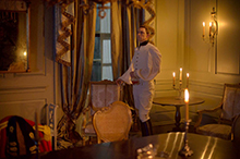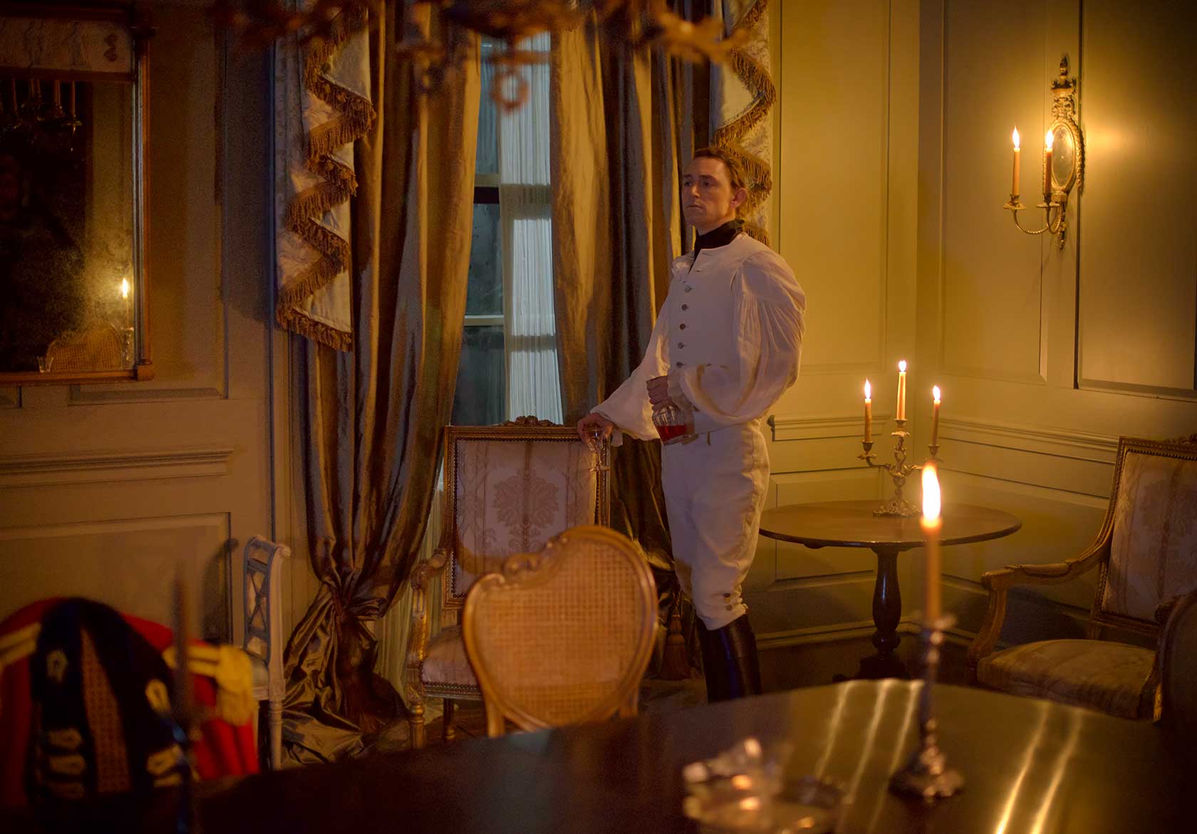 Right: "All the fireplaces on our sets can actually have fires… For the decor, we draw our inspiration from texts and paintings of the time as reference. All of the paintings used on the sets are reproductions of artwork from the period." — Production Designer Caroline Hanania