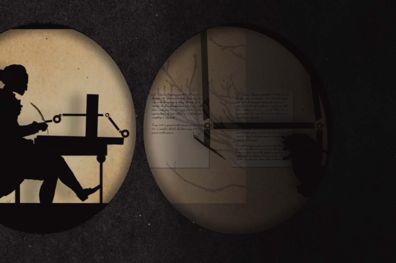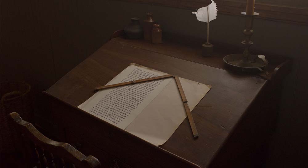 Right: "I’ve used quills to write some documents, but the old quills were cut much better than they are now, so I use a pen with a nib mostly. I'm often asked why I don't use brown ink, so they look like original documents. They used an iron rich ink that was black in the 1700s. The ink "rusts" over time and TURNS brown." — Prop Master Kelly Farrah