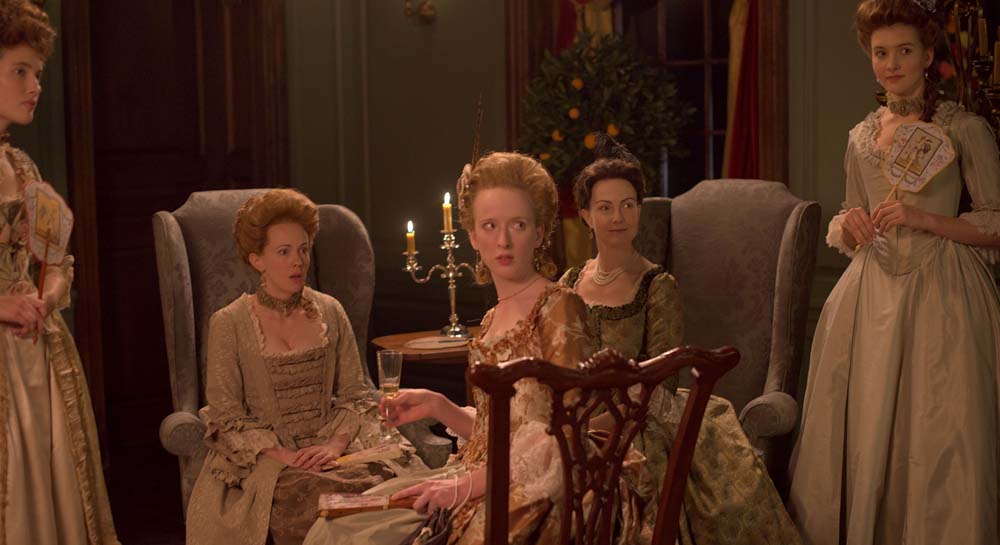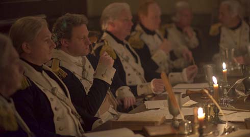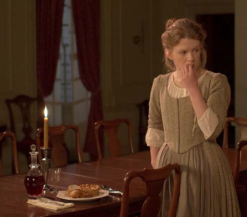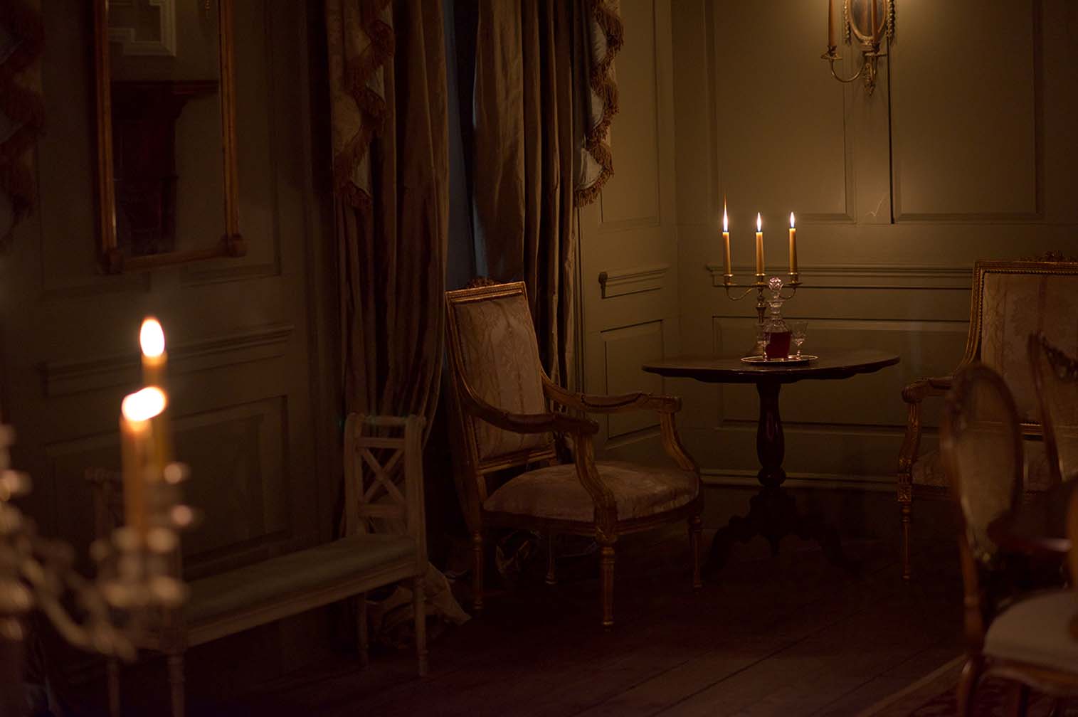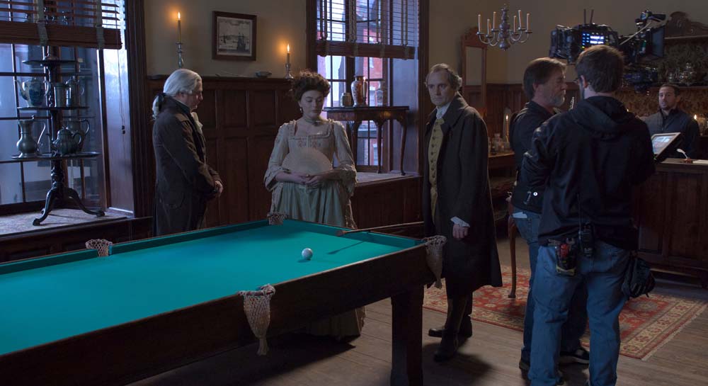 Below: "The Whitehall set that we’ve built in Richmond is extensive, with an upstairs set and a downstairs set. The Tuckahoe Plantation [boyhood home of Thomas Jefferson] is used as the exterior. The interior set is not necessarily modeled on the exterior, but there is a wood-paneled room in Tuckahoe which I’ve recreated to a degree: the Oak Room, where a lot of our scenes take place." — Production Designer Caroline Hanania