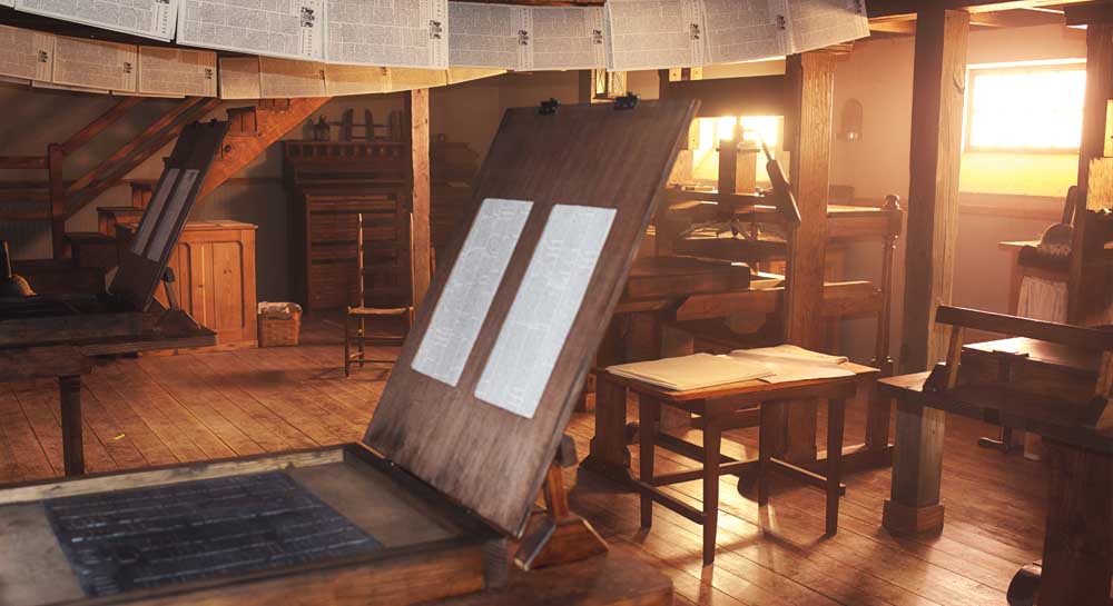 Below: "The Royal Gazette print shop contains four printing presses. We built those ourselves. Two of them actually worked, and they’re based on historically accurate printing presses that we saw in Williamsburg. They actually have a print shop there." — Production Designer Caroline Hanania